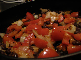 5. Throw your onions in a pan with some olive oil and saute until translucent; then add the tomatoes, salt, pepper and seasoning (I used a Mexican one). Once this mixture is a little bit bubbly, add in the black beans. Cook for 3-5 minutes.